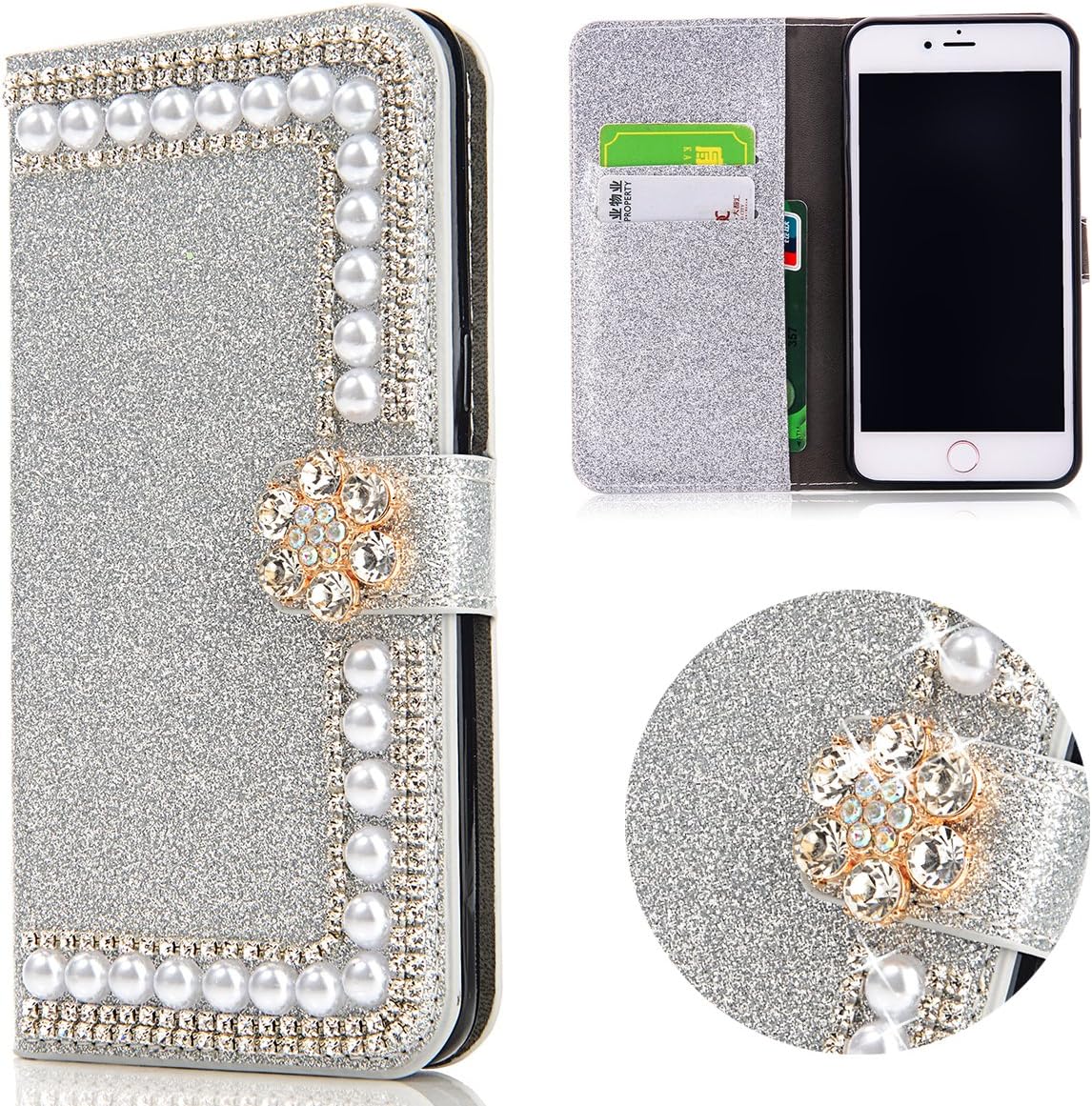 Amazon Com Iphone 6plus 5 5 Case Plecupe Bling Glitter Diamond Crystal Flowers Magnetic Buckle Pearl Sparkle Powder Leather Wallet Folio Cover With Stand Card Slots For Iphone 6plus 6s Plus Silver